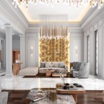 The interior is embellished with contemporary pieces of furniture, such as coffee tables with natural stone tops and rose gold metal legs, stylish upholstered sofas and armchairs in contrasting beige and grey, all of which seamlessly complement the overall design. The entire area is illuminated by charming modern lighting fixtures in rose gold metal, glass and crystal, transforming it into a majestic space providing a pleasant and comfortable setting.