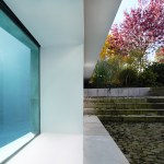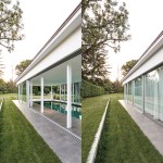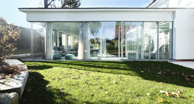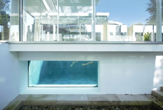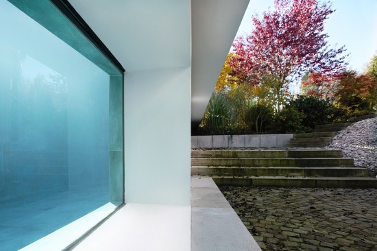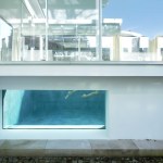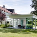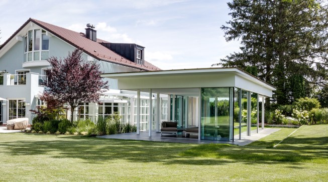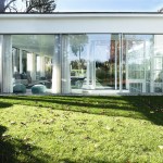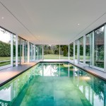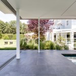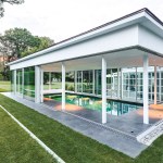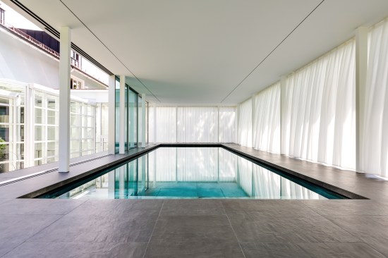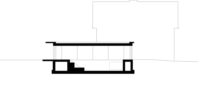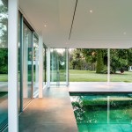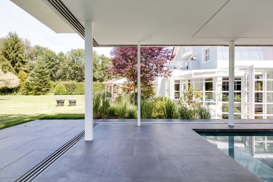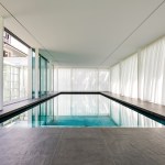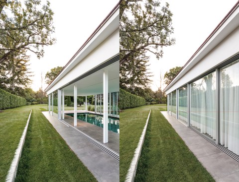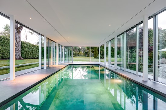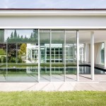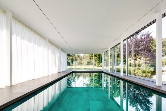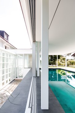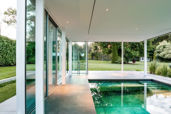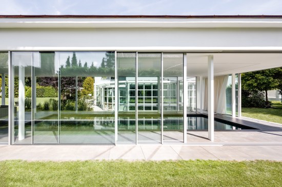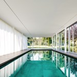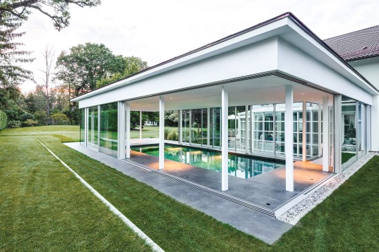 The task for a private client to build an indoor swimming pool in the rural surroundings of Munich, Ismaning, led to the concept of swimming outdoors and the embedding of the building in nature and existing topography. Selection criteria for the positioning of the new volume on the site were, on the one hand, the orientation to the south and on the other the possibility of docking and thus extension of the family house. The existing exterior stairs that led to the outside of the lower level of the living area, has been extended, ensuring the connection of the existing inner spaces with the pavilion. The pool, a free standing shower column and a relaxation area represent the reduced functions. The new defined outdoor space, between the conservatory and the pool house symbolizes the intersection of existing and new. The design distances itself of the surrounding rural architecture and represents a clear contrast of lightness and transparency. The filigree steel pillars and window frames give the green roof a floating character. The glass envelope consists of large sliding elements which ensure cross ventilation and transform the interior to a covered outdoor space. A light curtain on the east and south creates a second skin, which in contrast to the glazed envelope gives a unified appearance while protecting privacy.