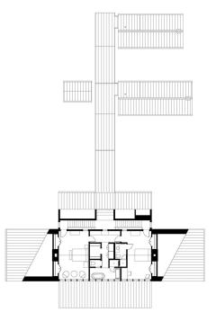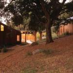 The main structure—made of sprayed earth from the site, recycled cedar siding, and certified lumber—is linked to the hillside cabins with an exterior arcade. “As you move up the steps, the walkway frames the oaks and connects your experience of being there to the larger landscape,” Griffin explains.