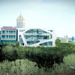 Saakashvili was looking to redevelop a stretch of land overlooking the capital city, right around the same time that a portion of the property was purchased by a wealthy individual as the site for a new house. When Mayer was suggested as the architect, the client was not keen on the idea. “At the beginning, the client was a little puzzled,” Mayer says. As the villa nears completion, however, the client seems to be more enthusiastic—about the vast interior courtyard, the complex three-floor arrangement (accommodating three branches of the family), and the enormous, irregular apertures that give this villa sweeping views of the city, the presidential palace, and the hills beyond.