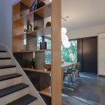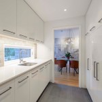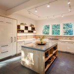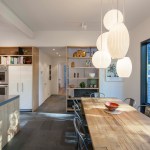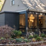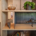 On the first floor, the kitchen was redesigned using a mixture of refined and rustic materials reflecting the clients’ interests. White high gloss, semi-custom cabinets, custom plywood with raw steel shelves, and a concrete countertop give the space a modern but crafted feel. The exposed joinery of the shelving reveals the hand of the carpenter and provides a wonderful setting for the collection of African bowls and primitive artwork that the owners display. The simple lines of the butler’s pantry act as a frame for the owners’ art, hanging on the wall beyond. Large windows were added and the ceiling was raised to make the room feel expansive. The new corner window floods the kitchen with light and draws the exterior in, giving the sense that one is surrounded by nature.