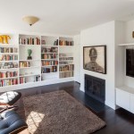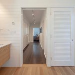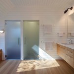 On the second floor, what was formerly a rabbit’s warren of small rooms and closets has been reorganized into a serene master suite. A sliding reclaimed wood barn door leading to the dressing hall lends a warm material presence to the room. Through the door, a hallway lined with white gloss cabinets on one side and art work on the other functions as a dressing gallery. The hallway opens up to a clean new master bathroom where a wood enclosed tub is bathed in sun from the skylight above. More images can be found at www.aamodtplumb.com/professors-row-renovation