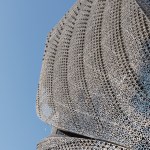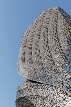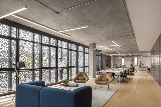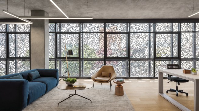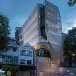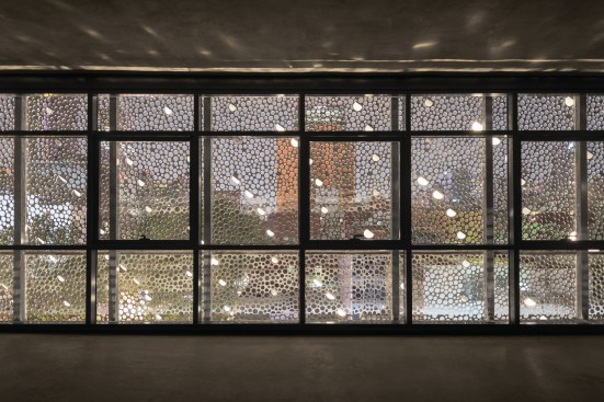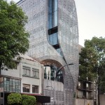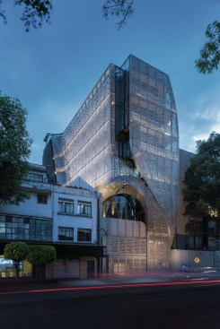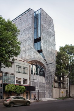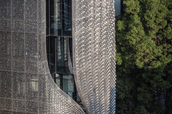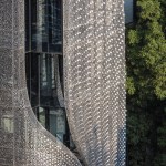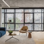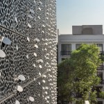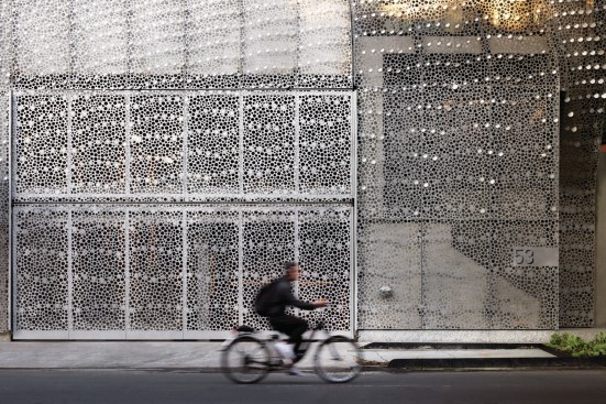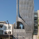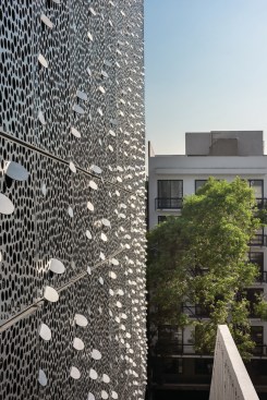 The two street-facing façades are united by a perforated carbon-steel with electrostatic paint that follows the curvature of the building mass. The overall pattern of the perforation emanates from a 2D projection from the point on the street where the two sides are most visible. Using a repeated pattern of increasing openings, vertical striations emerge, mimicking tuffs of a curtain. Some of the perforated material is left attached to the panels; these chads change in size to add further depth to the façade by softening the appearance of the steel, and at times, dematerializing the panels themselves. The variable angles of the tabs also create a dynamic effect as lighting conditions change; sometimes creating shadows while at other times, they seem to disappear completely. Overall, the perforation was optimized for ventilation and light, and maintains privacy and visibility for occupants. Our approach demonstrates new opportunities in mid-block design that engage the street while shaping the user experience.