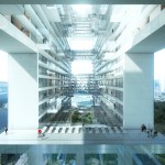 By pulling layers of the typical housing tower in opposing directions, the small units maintain their size, but are stretched into favorable proportions that provide views and daylight from both sides, excellent cross-ventilation, and a strong sense of community through the creation of a central courtyard, roof terraces, and conversation/reading/play pods.