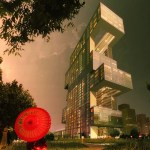 The 39-story Project R6 is located along the eastern edge of the Yongsan International Business District in central Seoul, South Korea, and is part of a master plan that calls for 22 multifunctional towers. Its architects describe the program as a transient “urban boutique residence” with a mix of 40-, 50-, and 60-square-meter (430-, 540-, and 650-square-foot) units and associated amenities. The designers base their configuration of the prescribed mix of studio sizes on a classic courtyard plan, with large chunks of structure pulled in and pushed out from a narrow connecting framework to create a distinctive zipper-like form.