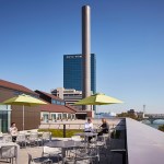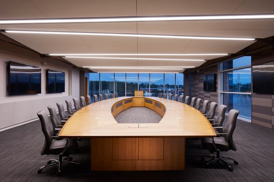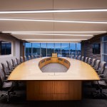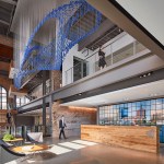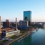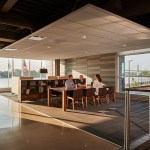 ProMedica’s commitment to health and wellbeing extends from the community and into the design of their office space. The headquarters includes a 5,500-square foot YMCA on the lower level of the junction building, and two restaurants on the ground floor. The designers employ principles of biomimicry and design strategies connect interior spaces to views of the landscape beyond. Natural materials, native to the site, are utilized and every desk features a sit-to-stand work surface. Employees have constant access to outdoor spaces, with opportunities to take walking meetings or a lunch on the promenade. The cafeteria spills out onto the Riverwalk, and a roof deck on the fourth floor provides employees with scenic views across the Maumee River.
