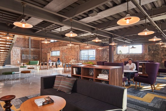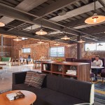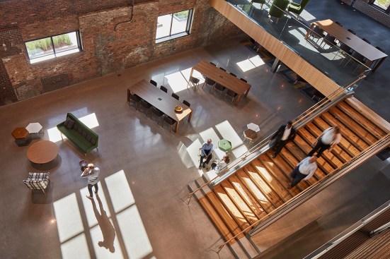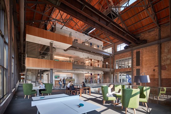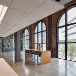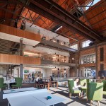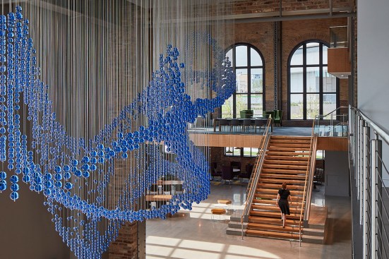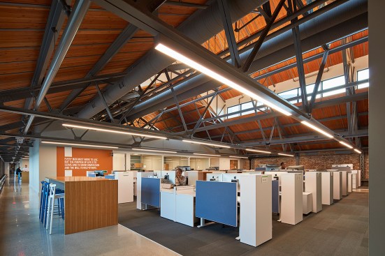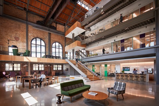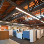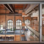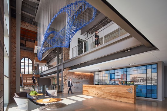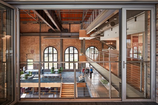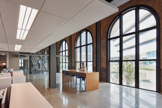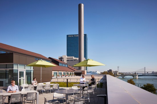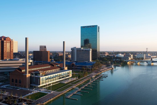 The campus represents an architectural timeline of the development of the Toledo waterfront. The newly updated Promenade Park, part of the HKS-designed master plan for the Toledo waterfront, includes new landscaping, a variety of spaces to host public concerts and festivals, and engaging, public art installations. Gathering spaces in the headquarters highlight elements of hospitality and refreshment. Reclaimed wood adorns the atrium café, which also features pendant lighting that was saved and restored from the original Steam Plant building. The atrium can be transformed into event space for after hour happenings.