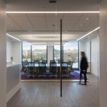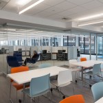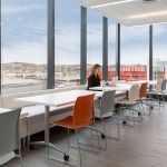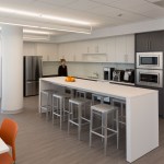 The color scheme borrows from the company’s corporate identity with blue, purple and burgundy accent colors contrasted with neutral gray flooring and walls. A variety of work areas support different work styles including 120 open plan work stations, huddle rooms and breakout areas. A kitchen/lounge area with several styles of seating serves small group meetings and company-wide gatherings. The lab areas include biology, freezer farm, microscope room, and two tissue culture labs. The large, north-facing lab offers sweeping views of the surrounding neighborhoods.