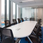 We have recently designed new facilities for Proteostasis at Boston Landing. The 29,836 RSF office and lab space is on the 5th floor. Arriving in the elevator lobby one immediately experiences an open feeling with views to the exterior through to the reception area and board room which were conceived as a single space. The scheme was developed to take the most advantage of natural light and views, by placing all the open office work areas and the main break room along the large south facing 12 foot high windows. Demountable glass partitions underscore the sense of openness while maximizing acoustical privacy.