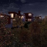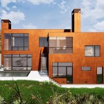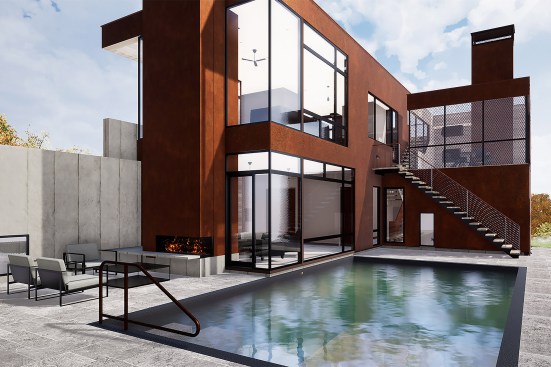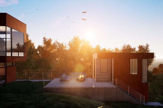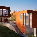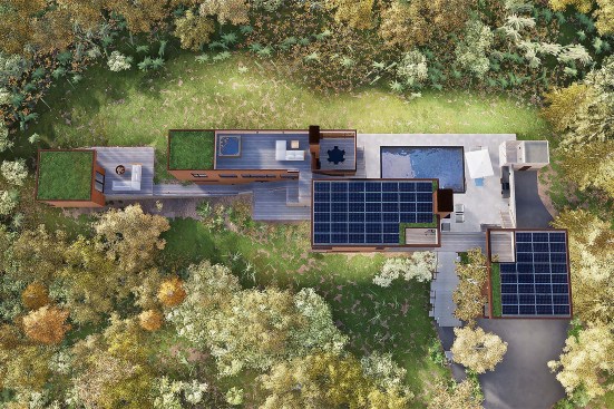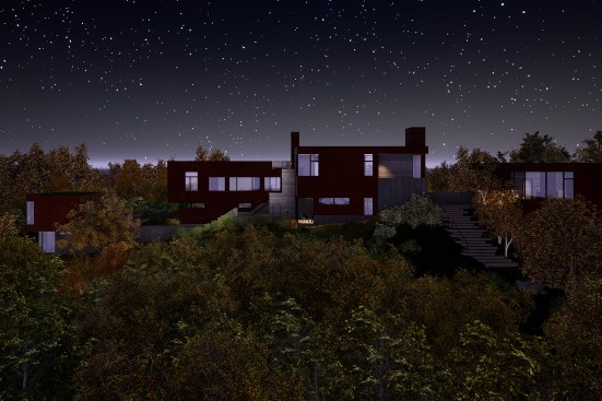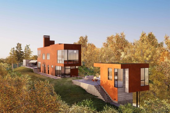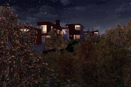 Adjacent to the Cape Cod National Seashore, the Provincetown Residence occupies a wooded dune with expansive views of the Atlantic Ocean and Cape Cod Bay. Designed for a couple, an artist and a fitness trainer, the design includes a light-filled studio, gym, and office. From certain angles, it gives the impression of multiple, disconnected buildings; the three distinct structures hug the dune’s sloped terrain, leveraging the unique topography to create elevated living areas and roof decks. The two larger volumes shift past each other; the forms essentially overlap, creating space for a central stair, where five levels coalesce. The south facing bedrooms, living spaces, and pool terrace get optimal sun exposure. The outdoor spaces, designed for entertaining, include a poolside kitchen, secluded fire pit terrace, screened porch, and a roof deck. The sustainable design includes green roofs, photovoltaic arrays, and an energy-efficient envelope with triple-glazed fenestration. The project’s plantings are indigenous, and the existing woodlands remain intact. The structures’ cladding materials—copper, cedar, and concrete—will weather, developing rich textures that will blend with the natural setting; the house will become part of the landscape.