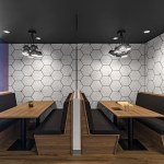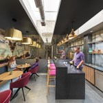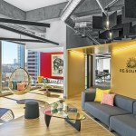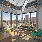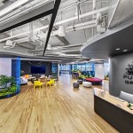 Each floor was conceived to create visual connections to the cityscape, as well as establish intimate links among work stations. Main reception on the 19th floor (top floor of the building) is at the end of a short journey from the elevators through a corridor with a raw concrete wall on one side, and a dichroic glass wall with colorful abstractions of the company’s logo on the other. The open space introduces several recurring concepts: retail-like storefronts, brand signage, rustic wood flooring, exposed building systems painted white for light reflection, and expressive geometric lighting. “Boulevards” lined with plants and custom curved seating extend from the lobbies to work areas. Corresponding undulating soffits are painted a dark gray and lead to colorful branded “portals” that frame work zones dedicated to the different brands under the Publicis umbrella. While the three floors are unified by a palette of neutral, industrial, and authentic materials—such as wood, glass, and concrete—each brand is distinguished by environmental graphics, signage, colors, and materials that Blitz tailored to reflect the distinct identities.