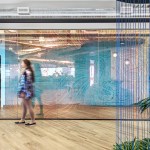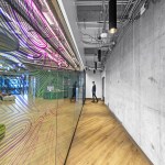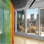 Blitz cleverly and creatively controlled the balance between privacy and transparency using innovative materials. Parachute cord is installed in various brand colors vertically along glass panes, while decals of vertical stripes imitating the cord are applied to other glass surfaces; in some areas, both cord and decals create greater depth. The 19th-floor boardroom is enclosed in curved glass walls lined with a specialty film that allows light and views to penetrate, but blocks outsiders from seeing proprietary information on screens.