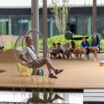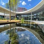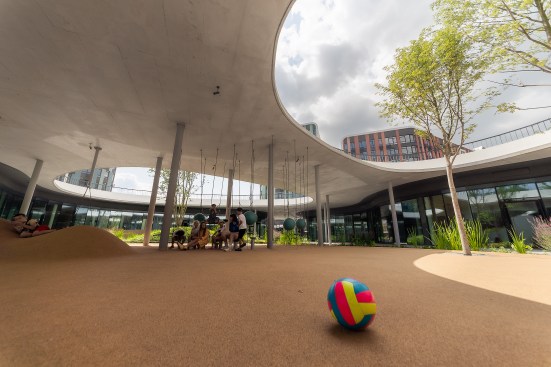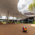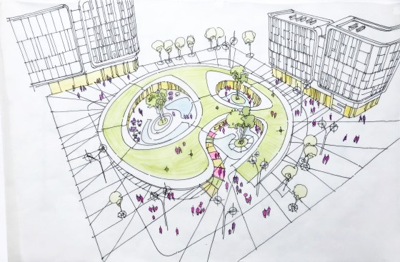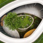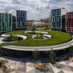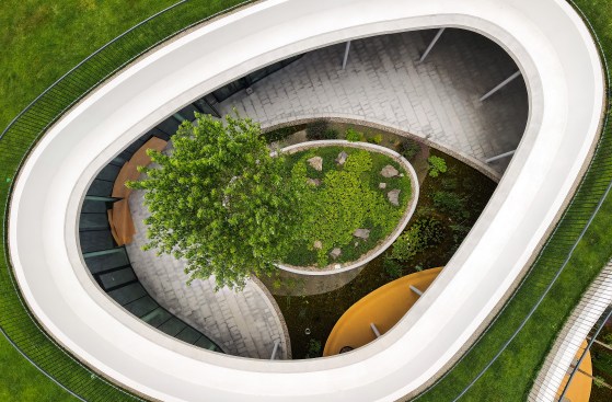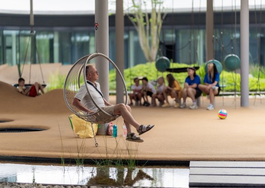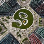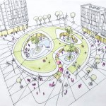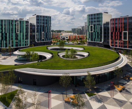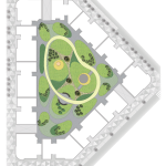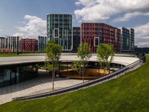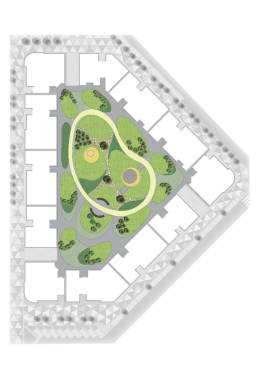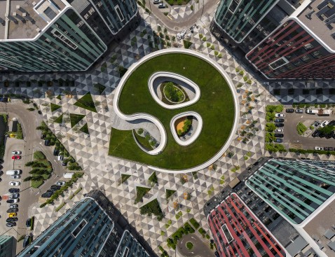 Public space is located in the center of the square, where the functions of leisure and communication with nature are combined. The green roof is open for operation. In the middle of the pond, there are two islands – a green hill with a maple, rising above the green roof through a specially designed radial hole. The hill is lined with ground cover plants to emphasize its shape. On the other island, there is a playground with slides, balancers, swings, and trampolines.