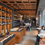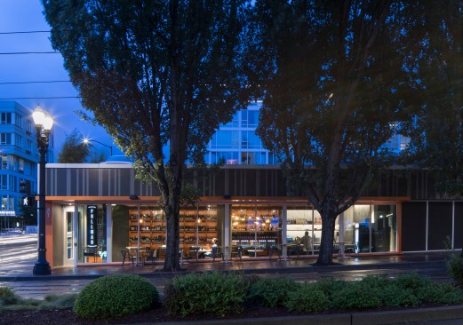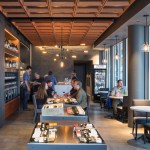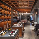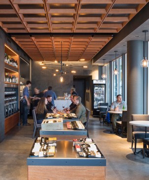 Pullman Wine Bar and Merchant by David Machado Restaurants brings a new concept to Portland’s Lloyd District. Located in the southwest corner of the boutique Hotel Eastlund, also designed by Holst, Pullman occupies a formerly empty retail space facing the Convention Center. To accommodate a range of functions—retail shop, tasting bar serving small plates and wine by the glass, private dining room, and prep kitchen—the design reclaims further square footage from the hotel parking garage. The sequence of spaces progresses from public to private and creates a range of experiences in less than two thousand square feet.