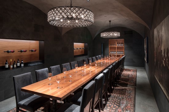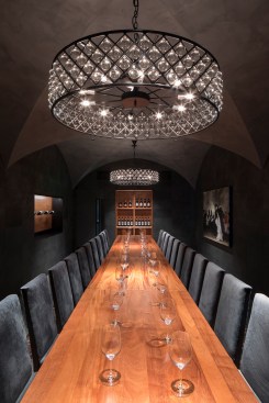 The private dining room seats twenty-four guest in a wine cave-like room that channels a European, old-world aesthetic with vaulted ceilings and a dark, moody color palette. The slope of the sidewalk outside enhances the feeling of descending into an underground wine cave. Pullman’s novel concept and thoughtful design have combined to create a new attraction in the burgeoning Convention Center neighborhood.