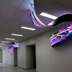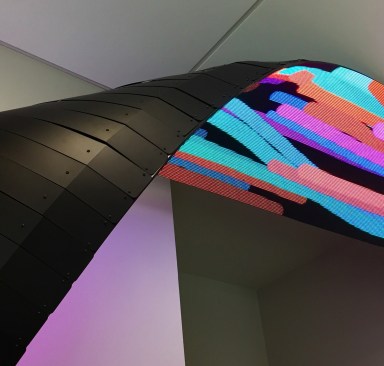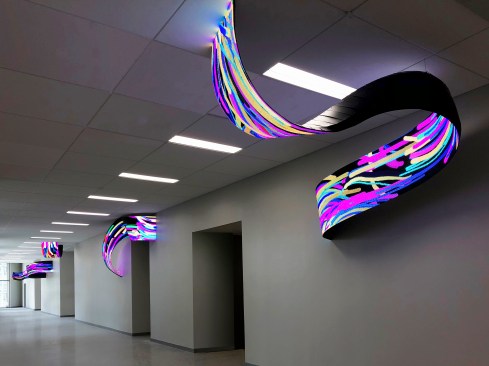 Completed in late 2018, `Pulse´ is composed of five curved screens that repeatedly emerge and disappear along a wall of the Zachry Engineering Education Complex at A&M University in Texas. The video content is an abstract array of multi-colored particles that run along the screens. Rather than being a looping video, an algorithm creates a generative animation that is reacting in real time to data related to the building’s energy consumption, including AC flow, internet usage, water and electric power consumption. Each energy source has been assigned a different color particle, which the visitor can interpret via signage. The artwork is a data-fed sculpture that is sensing the building’s own conditions as if it were a living, breathing entity.