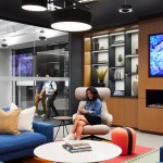 The club space features a fireplace, bar and meeting spaces. The common areas feature custom built in spaces that help welcome people to the building and support impromptu meetings.