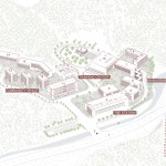 The fire station building represents the core function; strategically located next to the road access, its iconic facade represents a virtual gate to the complex, being the starting point of the whole masterplan development. The first floor houses the fire-fighting garage and equipment warehouse, in the mezzanine are located a training gallery and small meeting rooms, while the second floor is dedicated to the firemen rest activities: dormitories (with a maximum capacity of 30 beds), club, different relax and leisure areas, library and study rooms, a small clinic and medical and psychological counseling room. The second floor space is characterized by a series of iconic skylights which strongly mark the common spaces; together with the two squared courtyards, they help creating a better living space for the staff on duty.