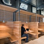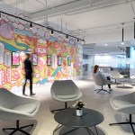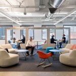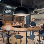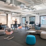 Quantcast, a leader in digital marketing and brand engagement, invited Huntsman to design a new, 95,000 square-foot, three-floor headquarters in the city’s tech-focused South of Market neighborhood with the goal of better reflecting the company’s dynamic image and fluid work culture. In the reception area, a custom glass media wall features digital video content to welcome visitors, while a minimalist palette of materials and colors – primarily grey and white, contrasts the warmer tones of a milled, washed-wood reception desk. This tonal juxtaposition is repeated further throughout the office space. A key highlight of the entry sequence is a vibrant wall mural designed by creative studio JaegerSloan. The graphic captures Quantcast’s lively culture as well as its product through vibrant, colorful illustrations. The open floorplan is optimized for flexibility and efficiency, allowing employees and teams to change locations freely. A variety of work settings support a balance of collaboration and focused work. Freestanding whiteboards physically delineate neighborhoods, while also improving transparency between teams. Daylit breakout areas are distributed in proximity to open work areas and offer heads-down space for quick meetings. Larger collaboration areas are located adjacent to the elevator lobby to prevent team members from other floors having to travel far distances. Social activities also play an important role. Cafés on each of the three floors provide amenities with varying seating arrangements and table heights, while a “town hall” space, complete with catering kitchen, facilitates all-hands events and is easily transformed with moveable walls and a custom mobile bleacher solution from Mash Studios. The signature “moment”, however, is the QFS Bar, an oasis where one feels transported to another place. In contrast with the minimalist palette of the office spaces, richer, tones and materials, including dark grey felt acoustical panels serve as a backdrop for custom neon signs. Exposed ceilings, polished concrete floors, and steel rebar barstools underscore a more industrial aesthetic. Various settings, including walnut booths, a U-shaped bar, and game areas offer Quantcast employees an opportunity to take a timeout and reenergize before heading back to work.