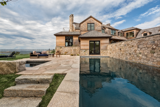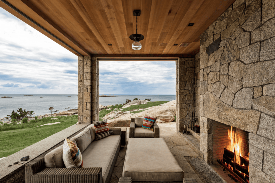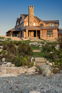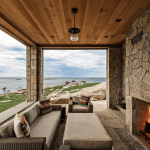 Set on a stunning peninsula with private beaches, this design takes advantage of the site and its varied topography to create an open, inviting home. The interior features natural wood and abundant windows that offer light and expansive ocean views. The home’s roof deck includes a bar for entertaining with a 360-degree vista, and outdoor spaces include a pool area and lounge with stone fireplace. The contemporary vocabulary is highly weather resistant using an advanced building envelope intended for the harsh weather of the exposed site.