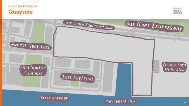 Sidewalk Toronto will begin with a new neighbourhood, called Quayside, located at Parliament Slip, just southeast of Downtown Toronto. Sidewalk Labs and Waterfront Toronto aim to bring the innovations advanced at Quayside to scale across the Eastern Waterfront, more than 325 hectares (800 acres) that represent one of North America’s largest areas of underdeveloped urban land.
