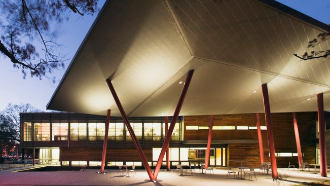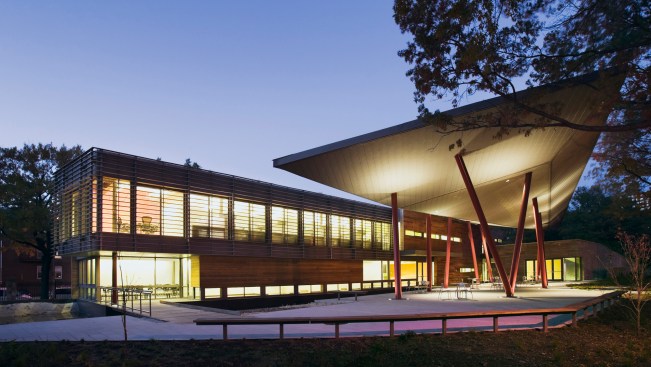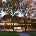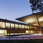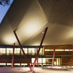 The Center is composed of three interconnected spaces: a forecourt and dramatic roof canopy, a central reception and administration building clad in wood and glass, and an auditorium space tucked into the landscape itself, sheltered by a sloping green roof. Additional sustainable elements include solar panels, a geothermal system, graywater and stormwater management systems and extensive use of recycled and renewable materials.
