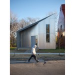 R-House transforms a typical gabled roof into a simply folded surface that recalls the appearance and scale of neighboring houses. Its compact exterior belies expansive and luminous spaces within. Windows open the interior to views and are positioned to receive south light to help warm the interior. The roof and walls are sheathed with corrugated aluminum. The silver color, muted reflectivity and fine texture of this cladding contribute to a sense of vibrancy that counters the gray winter months. Humble, carefully detailed materials, such as concrete and structural wood floor deck, imbue warmth and integrity to the interior.