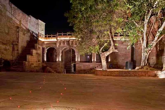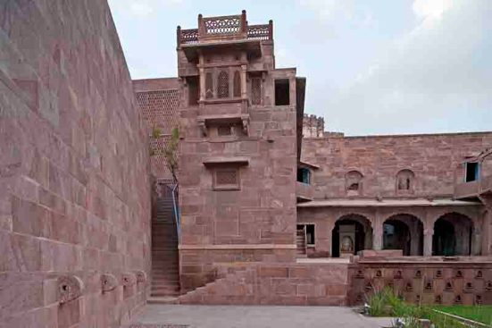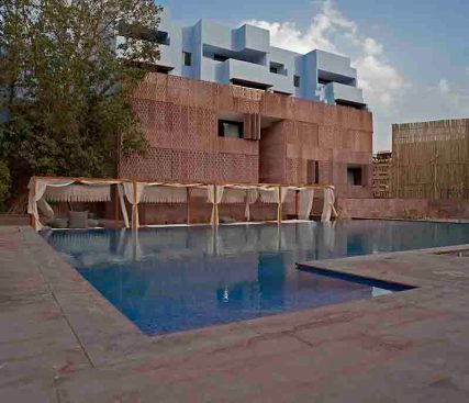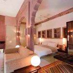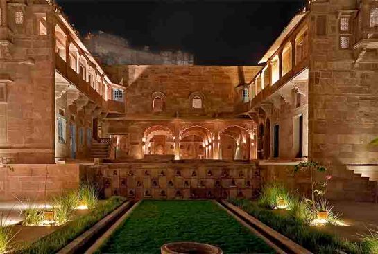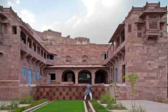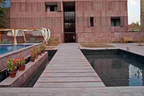 The property was inherited with three, beautiful period structures (17th-18th century) which have been painstakingly restored with traditional craftsman in the original materials such as lime mortar and Jodhpur sandstone. 36 rooms have been created, spread over 3 contemporary buildings, (using the same materials and skills as the traditional buildings) inserted into the site in a manner that they frame the visual and spatial relationship among the old buildings and the Fort, creating a dialogue between the old and the new. Inspired by the age old double skinned structures of the region, (the traditional stone latticed jharokha forms of Rajasthani architecture.
