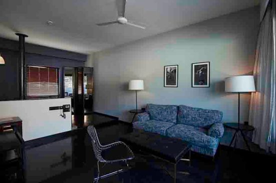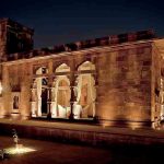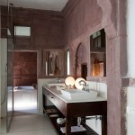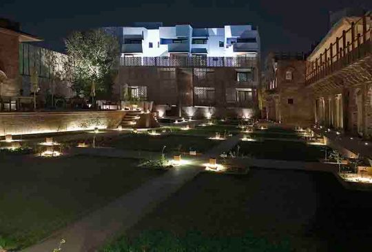 Crafted by over a hundred regional artisans and master-craftsmen, the development of building and interiors – is conceived and executed using the fundamentals of sustainable architecture. 70% of the materials and people used on site have been sourced locally, most within a 30 km radius. Every element is handcrafted with a focus on simplicity, and function – beauty being the skill and care of the craftsperson that has gone in to creating the piece. Materials include hand cut stone, poured in situ pigmented cement terrazzo on floors, walls and as furniture. Locally crafted furniture and cabinets in sheesham (a local Indian hardwood). The large central courtyard houses the three restored heritage buildings.