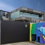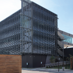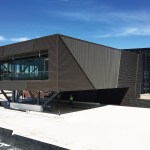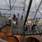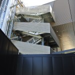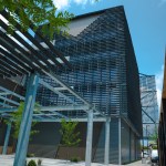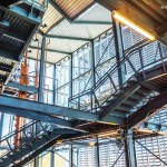 The building is primarily composed of glass, metal, and blackened wood louvers. The jewel in the “crown” is the Manufacturing Atrium. The project also repurposed an old warehouse on the site and an 8000-square-foot, ca. 1930 church structure nearby.