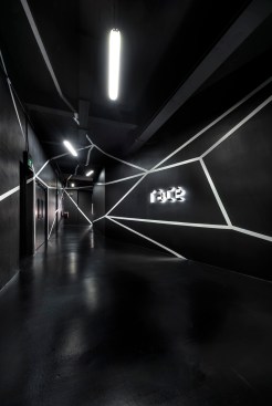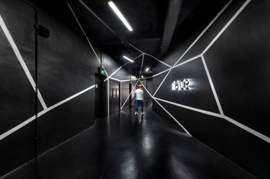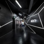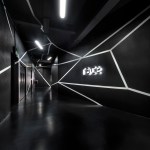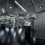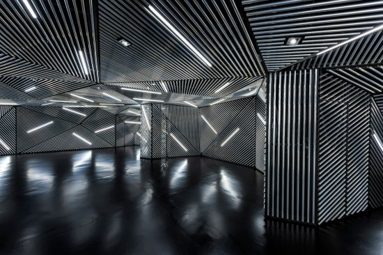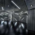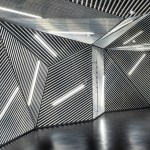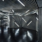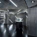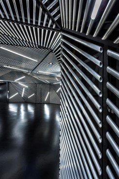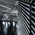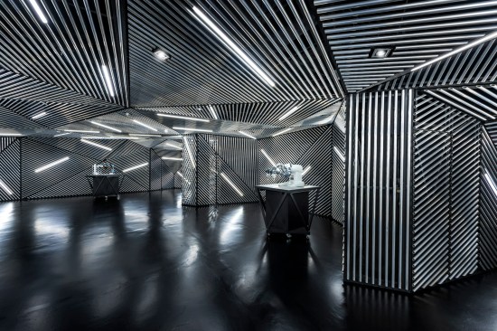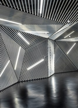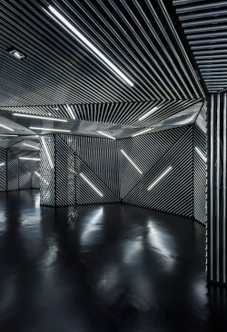 Upon arrival at the lift lobby, a vivid prelude to the laboratory space greets the viewer. A web of soaring white lines cut through the black space to create an anamorphic experience to disorient the floor from the ceiling. From the black envelope of the lift lobby, a custom oversized door pivots open to reveal a dramatic metallic faceted space, creating a contrast that is at once striking yet complementary.