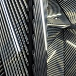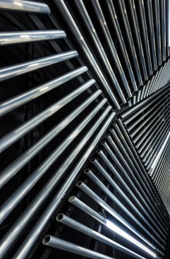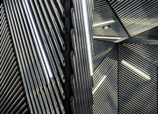 For maximum flexibility to the space, MOD introduced a “second” skin – developed to seamlessly create a dynamic space by deconstructing the ceiling and wall planes into an array of dazzling facets. Each facet comprises stacked layers of hand-cut aluminium hollow tubing; rotating the direction of the tubes with every facet to create a bold multi-directional effect. The aluminium screen cladding also serves to cloak the necessary but unsightly mechanical and electrical services while allowing ease of access for operation. This skin was shaped in plan with enclaves for small group work clusters accompanied by separate access hatches to the services behind. The random sprinkle of custom LED strips serves to highlight the multi-directional panels with a cutting-edge aesthetic. Overall, the space provides a suitable future-forward backdrop to usher in an age of automation and robotics.