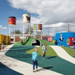 Guided by a community-engagement process that resulted in feedback from more than 1,000 locals, the new Railyard Park by Chicago-based Ross Barney Architects and Arkansas firm AFHJ Architects leverages this history to create a 5-acre town square. Trees along the west side of the site create natural shade for new seating located near existing local businesses. A boldly hued play space and a covered event area add to the park’s inviting vibe, while a splash park with three water towers that draw from the site’s past as a water stop for the Frisco Line references the town’s industrial roots. The new Pump Building and Restroom Building, which repurpose shipping containers, further nod to Bentonville’s heritage.