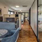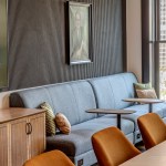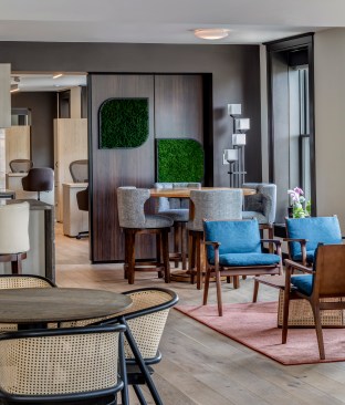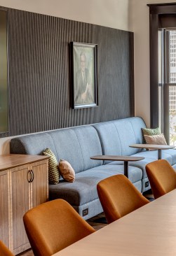 Renovating a 100-year-old building can be challenging. Layers of history are uncovered during construction, requiring architects to quickly devise creative solutions to any unforeseen circumstances. Because McIntosh Poris designed the apartments for the building’s previous refresh, the firm had an in-depth understanding of its history. This knowledge was invaluable for efficiently opening up three apartment units to function as flexible office and meeting space. Because RCWJF is a growing organization, McIntosh Poris incorporated demountable walls, anticipating future office re-configurability. Unobstructed natural light passes through glass office walls, and other walls include whiteboards for collaboration. Several existing elements, such as the previous apartment kitchenettes and restrooms, were repurposed as new office amenities, reducing construction waste.