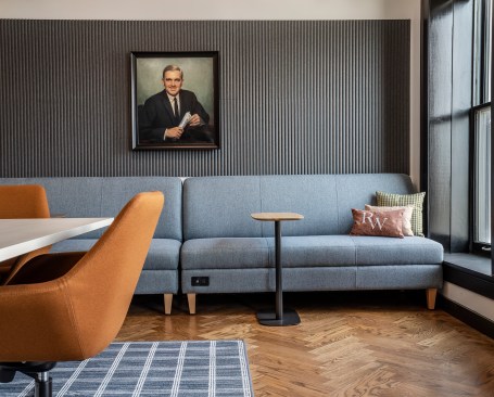 The second floor received new furnishings to make it more welcoming, better reflecting RCWJF as a company. Gathering spaces were revamped on the second floor to reflect the foundation’s growth and changing needs. Less formal seating areas with mid-century furniture allow for spontaneous social interactions. The herringbone wood floor and historic window trim give subtle nods to the past, while providing a fresh framework for a modern work environment.
