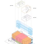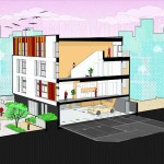 Rampart Loft dynamically reaches out from its busy intersection, invoking a sense of movement through shape and color, thereby insistently standing out from the concrete jungle background. Rather than being built in separate layers vertically, floor by floor—as are most apartment buildings—the Rampart Loft space progresses across the horizontal line, creating a seamless curved form from East to West and around the South vertical wall. The lines of the building blend into a bold floorless work of art, rather than a traditional wedding cake-like design (basement is split from upper floors). The curved exterior creates a feeling of continuity as each vehicle approaches and passes by. White and steel-grey define the building and serve as a backdrop to emphasize the vibrant vertical pops of the city’s iconic sunset colors: red, orange, yellow. The smooth flow of recognizable colors defines the building against—while at the same time blends it into—the urban cityscape.