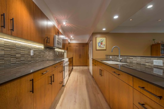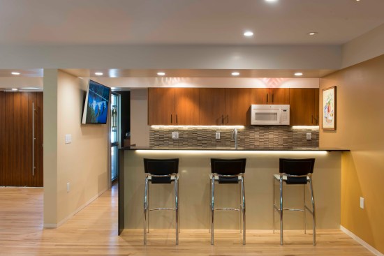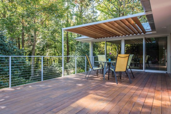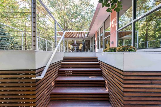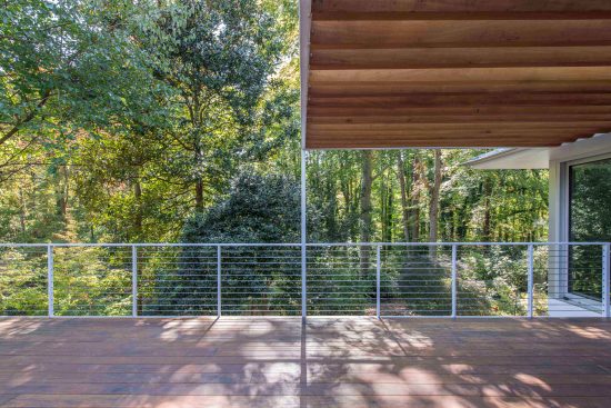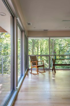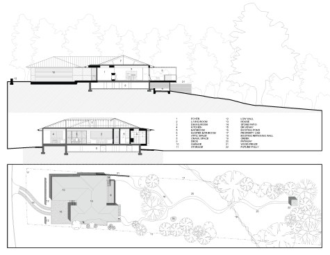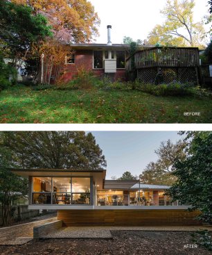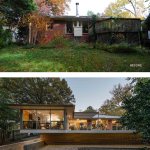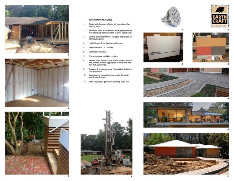 The mid-century explosion of ranch style homes across the country and the style’s subsequent decline in popularity has left Atlanta with a large homogenous stock vulnerable to tear downs, MacMansion-ing, radical tampering and other typical unfortunate expediencies. Rapid urbanizing growth is now surrounding this home’s formerly suburban neighborhood, just outside of downtown Atlanta. As urbanization continues and interest in mid-century design increases, the older ranch homes with large lots and mature landscaping become more and more desirable. After touring this long-time owner’s home, property and neighborhood we recommended retaining the existing character and structure. Our final solution for renovation and additions: (1) Satisfies the Owners’ desires to bring order to a chaotic plan and open the home to the beauty of their wooded lot. (2) Respects the style of the house and contributes a readily visible example to the existing neighborhood that additions and renovations to ranch style houses can be adapted to current lifestyles while remaining true to their original character. (3) Fulfills the Owner’s request for a sustainable energy efficient home The site’s most notable feature is an unusually deep lot sloping down to a small branch, populated by mature trees with a large beech the most outstanding example. Their primary request was extensive glass on the back of the house coupled with a deck off of the living areas facing south into the stunning site. Our solution reorganizes the floor plan to their intended lifestyle, opens view corridors through the house in order to visually expand the size of the rooms and successfully extend them into the landscape. Gardening is a favorite occupation of both owners and a large deck with room for outdoor dining and container plantings stepping down to the backyard was essential, as was a potting shed and storage located below the deck. Sustainable features include: • Renovation of an existing house. • Geothermal heat pumps and an energy recovery ventilator installed in the crawl space. Vertical geothermal wells are installed below the new driveway for heating, cooling and hot water. • Oak flooring and brick veneer were salvaged and re-used • High albedo standing seam metal roofing • EarthCraft Certification • Low or no V.O.C. materials and finishes throughout • Waste landfill diversion program • True Stucco • Thermally broken aluminum storefront, doors and windows with low-E coatings and solar heat gain coefficient exceeding energy code requirements. • Broad eaves and trellises shade glazed areas of the house in summer and allow winter sun to penetrate and assist in heating. • Spray wall and roof rafter insulation • Crawl space was insulated, de-vented and a vapor barrier, radon venting and insulated ducts installed.