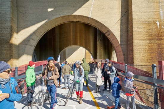 Previously, access from the Bronx to Randall’s Island was arduous and indirect, requiring the traversing ramps and stairwells along the RFK Triborough Bridge. The new multimodal path runs under the existing Amtrak trestle, which is still active. The grand scale of the railroad trestle and its arches frame a powerful experience for pedestrians and cyclists.