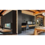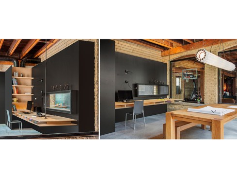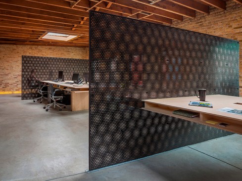 An oversized communal desk with integrated storage was placed in the center of the room. Structurally supported by two thin perforated metal screens, the desks appear to be cut into smaller segments, defining multiple work areas needed within the single shared space. These striking sheets of metal are designed to be visually intriguing, enhancing the raw qualities of an existing skin. To further separate the office from its adjacent zones, we introduced a continuous black “binding wall” snaking through various programmatic needs. Storage, mechanical closet and a private office are carefully sculpted within this single move. The lack of natural daylight in the space was solved through the placement of large panes of glass as separating walls, borrowing light and adding views throughout. Now, the occupants are more connected with their immediate surroundings and feel much less contained.