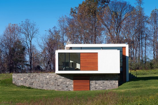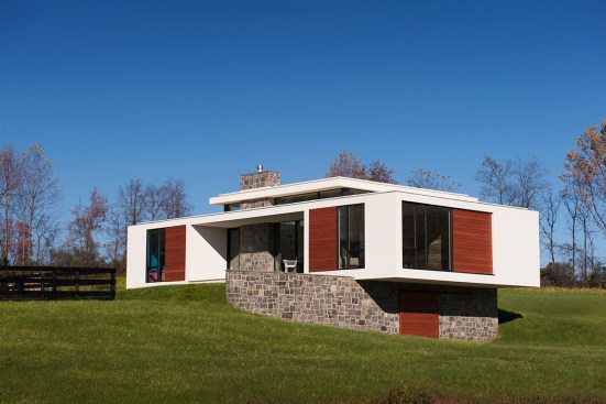 Built in 8 months, the four-bedroom home hangs over the hillside with a cantilevered master bedroom. The 3,200 square foot house was built for half of what it would have cost inside-the-beltway.