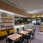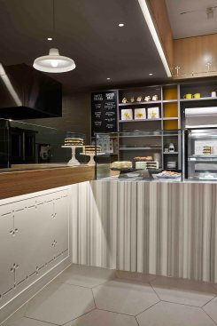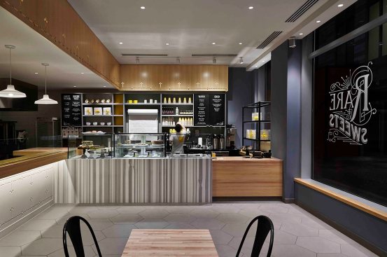 As RareSweets customers queue in front of the icing station they will appreciate the comforting design palette that mixes white, grey and honey-stained pine and ash tones with the bakery’s bright-yellow brand color.