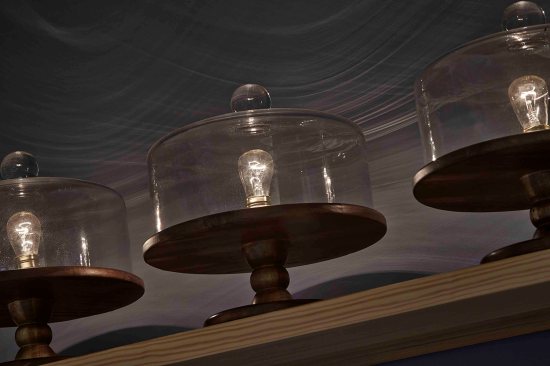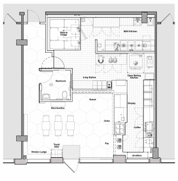 Like Tomason’s culinary creations, the RareSweets design reinterprets heritage baking in a fun and modern way. For example, a wooden apron – inspired by a design motif found in old cookbooks and pie tins – outlines the baking area. Larger, horizontally-stacked subway tiles face the walls instead of traditional subway tiles. Supersized hexagonal floor tiles replace the traditionally small-tile treatment. Butcher block and Mink marble countertops replace the expected Carrera marble. And glass cake domes become light fixtures.