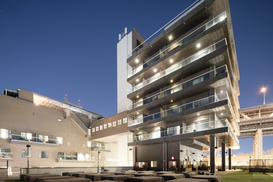 “We embraced the massive dimensions and proximity of the Queensborough Bridge, which dominates the hotel’s dramatic northern views,” Kratchman said. “Ravel is part of a trend in which underused sites near transportation infrastructure such as vehicular bridges, elevated automobile highways, and train trestles are considered exciting opportunities for new development. Building technology can now protect occupants from things like noise and pollution with better windows and filtered air.”