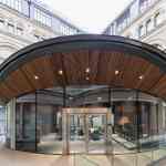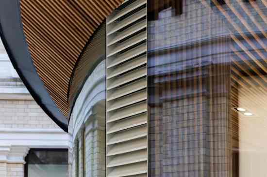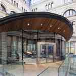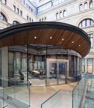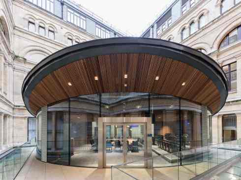 It is noted for its unique design. The glass, steel and wood building has a complex design, including a freestanding hyperbolic paraboloid roof structure, surrounded by a glazed oval walling system. A further challenge was the site’s constrained location. The steel superstructure had to be designed and built offsite and then lifted by crane into the courtyard, which is 90m away from the road, and with only 5m of clearance on either side.