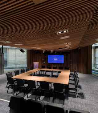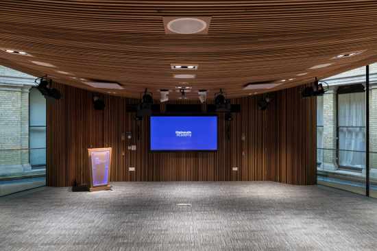 Opened by Prince William in March 2019, the Mayhew Theater is a teaching and presentation space built in the courtyard of the Foreign and Commonwealth Office building in London.