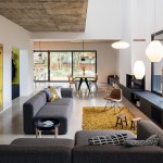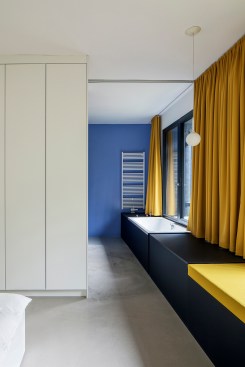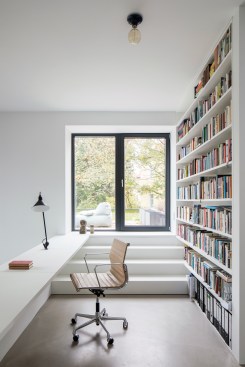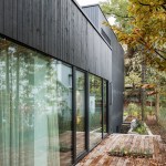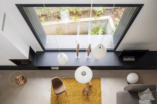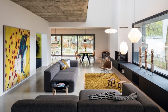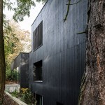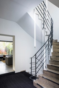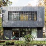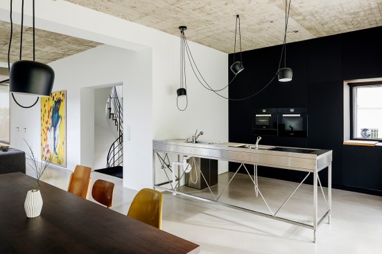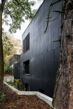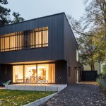SEHW Architektur gave new life to an industrial building in Berlin’s Zehlendorf district. It had endured several moultings, before it shed its skin and was reused once more. Built in the 70s for business and production, it followed a functional purpose: Staff area on lower ground floor, naturally lit by the shape of the topography, a big hall for delivery with machine shop on the ground floor and offices on the first floor. A clear grid with strong beams to keep the space free of any columns, exposed concrete without any visual requirements. The vacant house was stripped to its core, but the skinnings with the rough concrete of the structure, the skylights, the staircase with its terrazzo tiles and, with an ironic wink, the flag polls in the front yard remained visible. Today the house is used for living. On the ground floor a patio is placed between two living areas. A ceiling slab was removed to create a gallery between ground and first floor. A secondary suite was created where the former staff area was located. The exterior continues the play with plains, terraces, materiality and colours. A black gate, concrete, black gravel, timber decks. Grasses and perennial plants flourishing in different colours, while a mighty stock of trees is shaping the character of the building as a black box in the greenery. The house came alive once more and has some more lives to live, some more skinnings ahead. This really is something in our throw-away society.