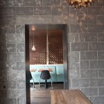The second phase of the restaurant included the addition of Room 4 that completes the overall vision. The small plate menu and dining experience was to be unique from Recess, while complimenting the original design. The narrow 11′ wide adjoining dining area is anchored with a long and low banquet that creates the base for the exposed steel ceiling/wall armatures that defines the space. Similar to the original cloth and wood features in Recess, the custom machined pixilated steel plates conceal the indirect lighting and provide the scale and intimacy to the space. The addition of orange resin coated tables, salvaged school chairs and the client’s large format rock images provide the color to the space.