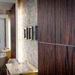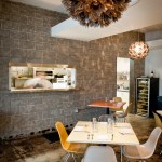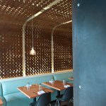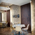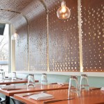 The restaurant’s front door leads you directly into the Kitchen, making you feel as if you have come home to dinner. The dining area is located in the adjacent bay, with an open table layout that allows for conventional two and four top dining, or joined together into a single table for family style dining. The addition of two bulkhead/wall armatures provide scale and intimacy to the space, concealed indirect lighting to highlight the walls, and provided acoustical treatment for the room. The furnishings complete the playground theme with salvaged mid-century school chairs in three colors, white resin coated wood tables in lieu of white table cloth table service, and the rich warm color of macasssar ebony wood panels to provide warmth. The panels are cabinet doors that open up to reveal a custom wall mural (still to be commissioned) installation that transforms the space.