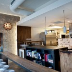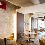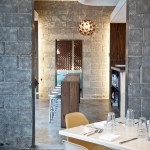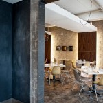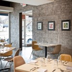 The spaces are connected with new masonry openings, finished with steel plates to create passages and transitions to each space. The entry area has a fixed table element that allows for waiting and congregating before and after dinner, as well as to provide the required separation for the adjacent bar. The exterior of the building was left original, painted and a series of awnings added to provide a playful and energetic image of the restaurant. The syncopated angled planes reach above the building’s original front facade and incorporate the name and logo of the restaurant.