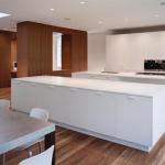 Two dramatic moves opened up the floor plan while also respecting the building’s character. One was to expose the skylight ring around the chimney so that it reads as an obelisk, anchoring the entire composition. The other was the use of bold contrasts to organize space. Flat-sawn walnut floors and quarter-sawn walnut casework wrap the living areas. Cabinetry and countertops are sanded Corian. “We thought, let’s find this voiceless casework that relates to the white brick and plaster ceilings,” Jameson says. “Corian has the luminosity of an eggshell juxtaposed with the brick. Those materials were a way of repositioning the house as organic and part of woods, and also tectonic and driven by the architecture.” Commented a judge: “It’s spectacular the way the different materials come together.”